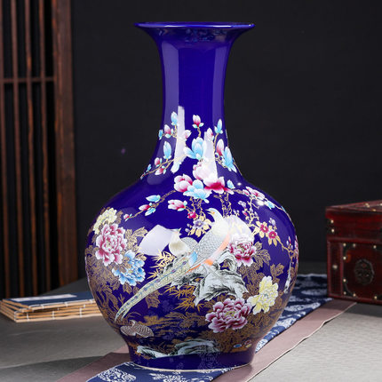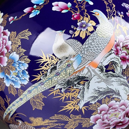 Royal blue magnolia flower and golden pheasant floor vase
